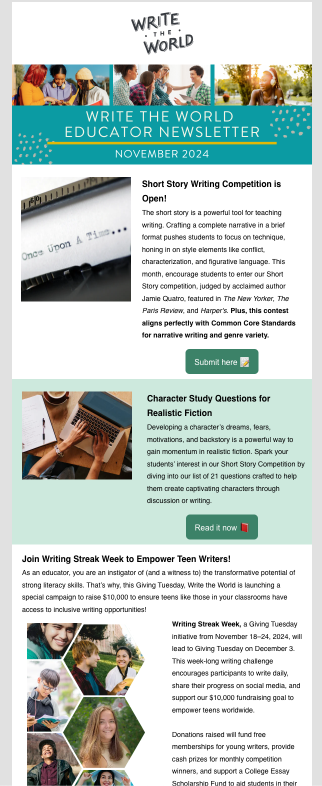 - Created compelling calls-to-action that encouraged educators to enroll students in the organization’s monthly writing competitions.