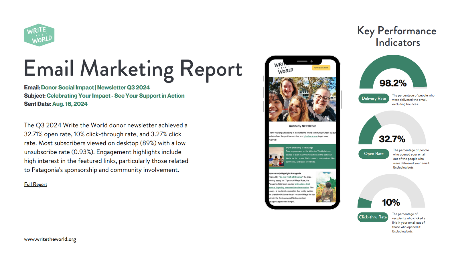 Write the World, a not-for-profit organization dedicated to improving student educational outcomes, sought to maintain and build on its communication and donor initiatives while temporarily down a staff member. The organization needed an organized, process-oriented, and entrepreneurial thinker with a passion for education to jump in and boost its marketing efforts. The goal was clear: enhance donor solicitation and conversion through strategic marketing campaigns.